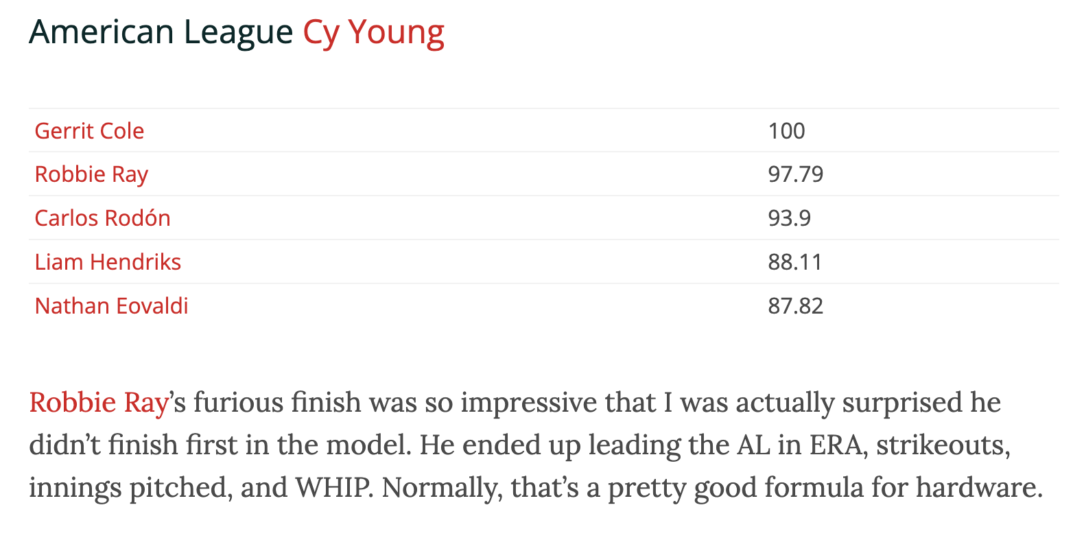 The last time I missed a race was in 2021. I remember looking at the AL Cy Young results and knowing the model had gotten it wrong. I said as much at the time.