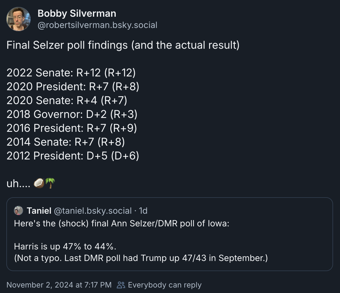 On Saturday night, a single poll dropped that, if it is even remotely more indicative of the state of the presidential election race than the conventionally herded wisdom, portends a result that will shock a whole lot of people on Tuesday. Ann Selzer is a well-regarded pollster who covers the state of Iowa for the Des Moines Register. There are many reasons not to over-consider Iowa as a bellwether for the nation — it’s lily white; it doesn’t have a city with more than a quarter million people; no single state could possibly do that kind of work. But Selzer’s output within that state has been very impressive over the last decade, hitting even more consistently than my MLB model: