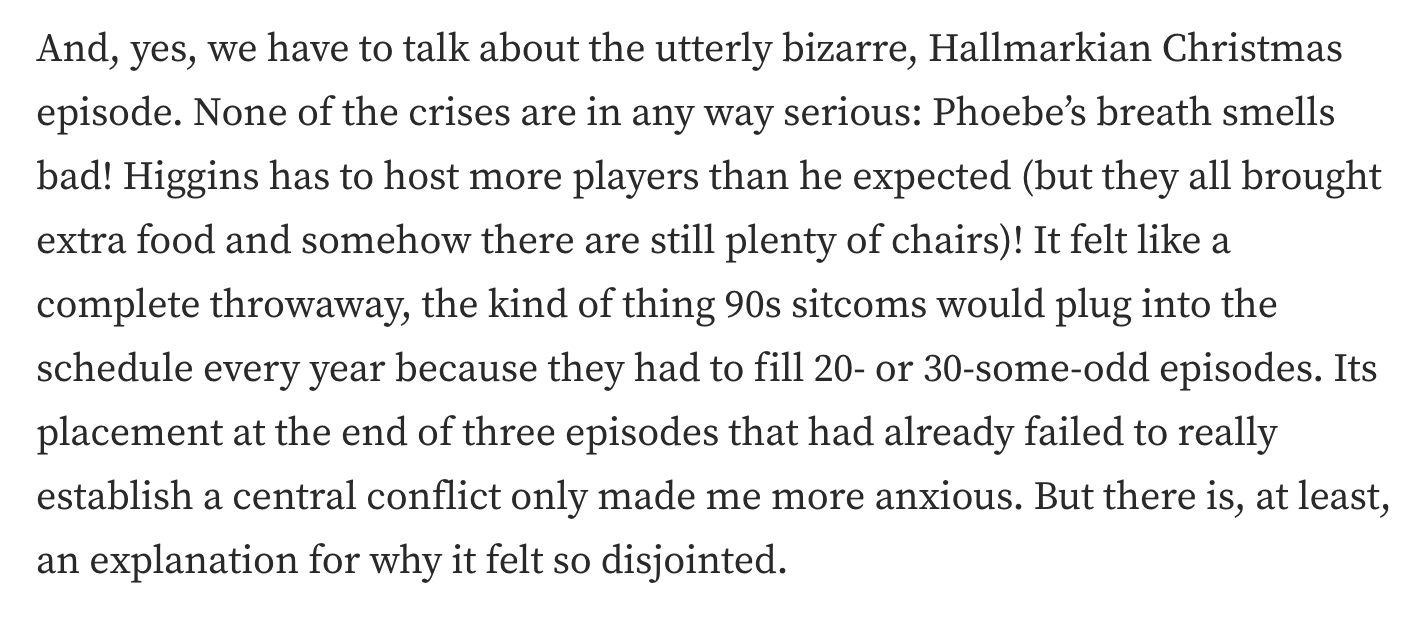 If you haven’t watched S3:E2 of the show yet, there is a fairly short, entirely otherwise unconnected analogy made regarding Hallmark Christmas movies.