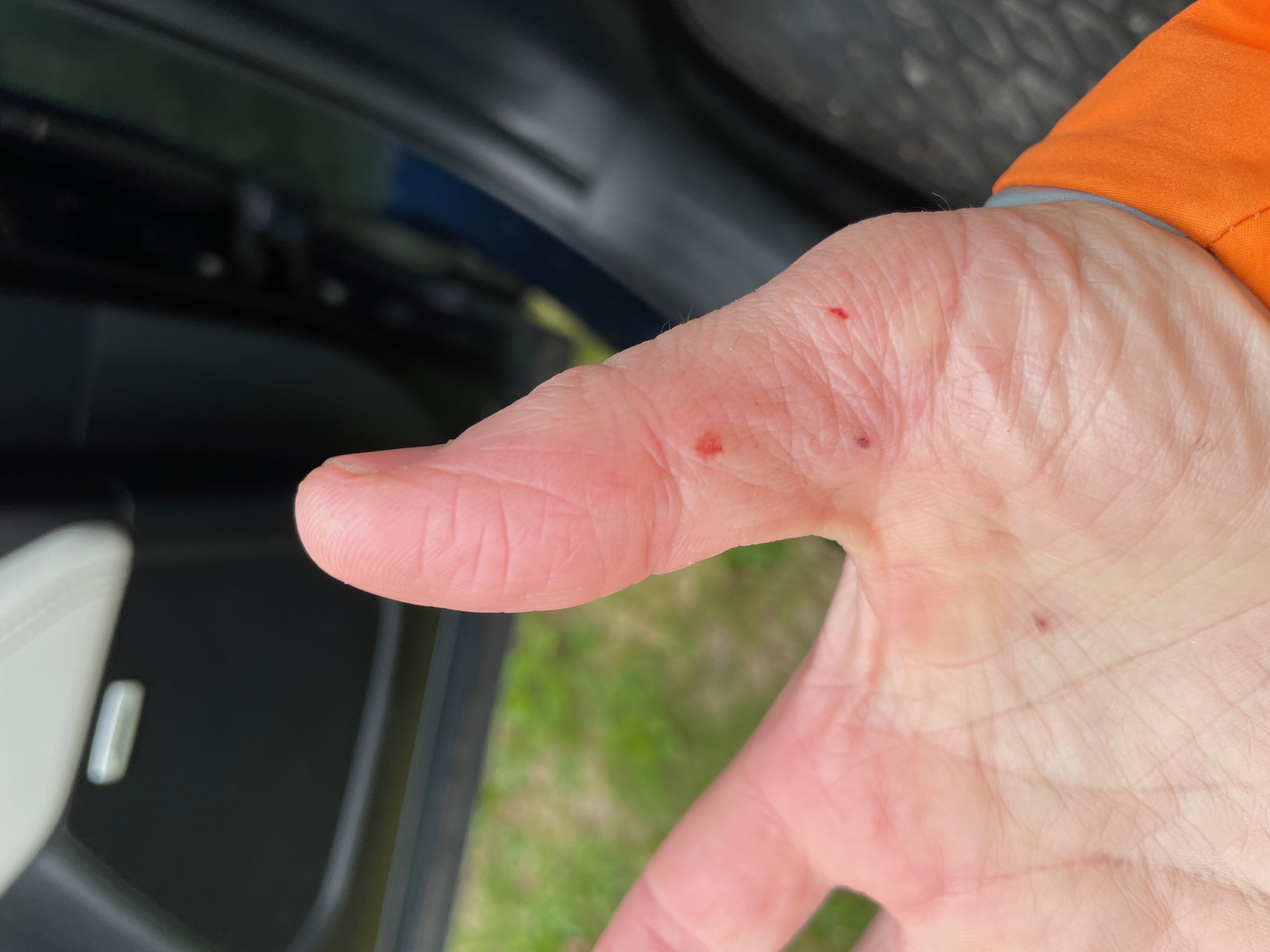 I realize that I actually did suffer a puncture — four of them. In my hand. From my crank, as I was trying to get my chain back on.